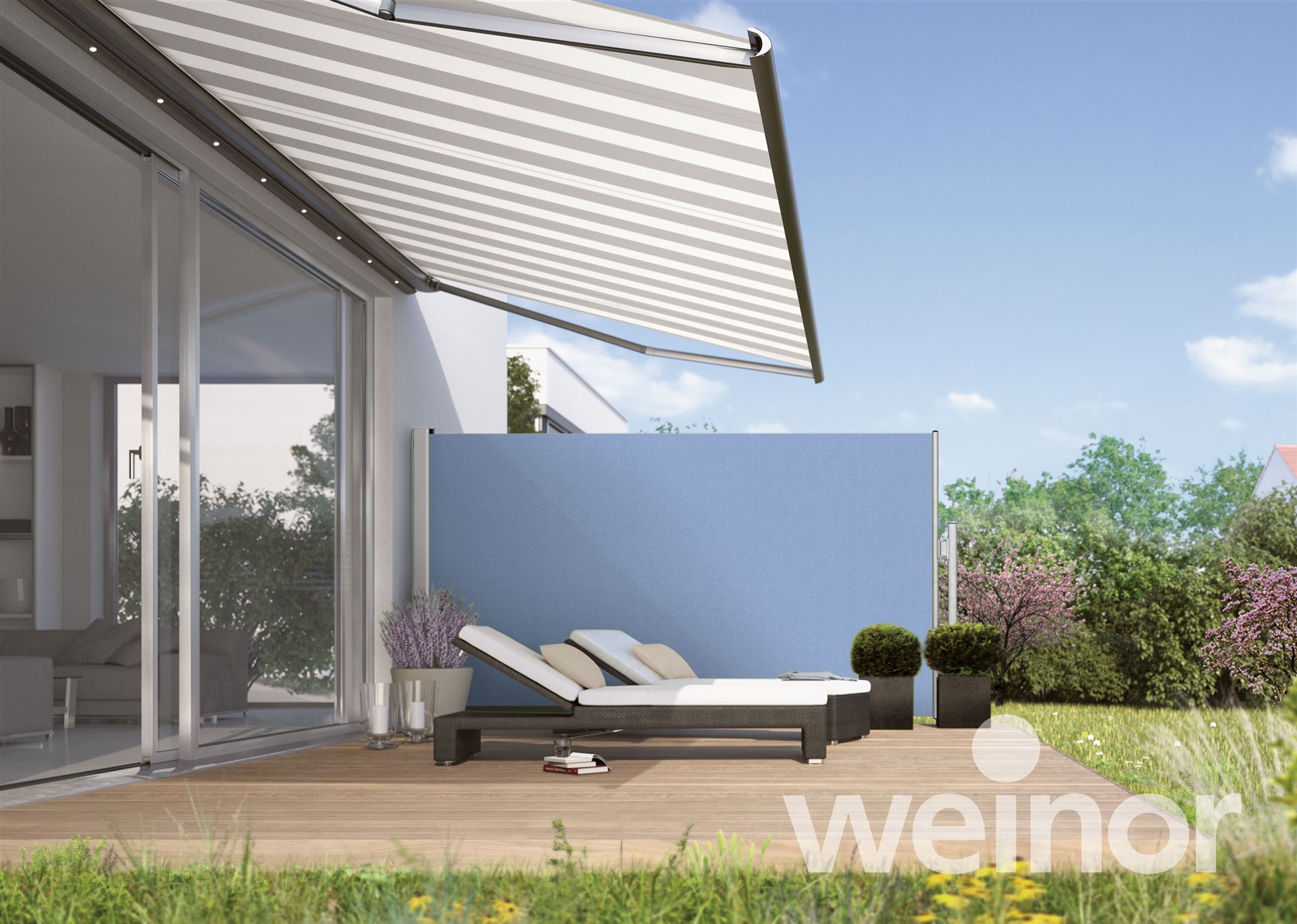 Ein Plausch über den Gartenzaun oder gelegentlich mal ein gemeinsames Grillen: Wer ein gutes Verhältnis zu seinen Nachbarn pflegt, lebt entspannter. Doch auch der Geselligste will ab und zu einmal seine Ruhe haben und sich ganz ungestört in die Privatsphäre zurückziehen können. Als Schutz vor neugierigen Blicken können beispielsweise senkrechte Seitenmarkisen wie "Paravento" von Weinor dienen. Sie stellen eine gute Ergänzung zu den Sonnenschutzmarkisen über der Terrasse dar und können farblich und formal genau passend ausgelegt werden.