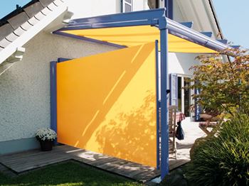 Seitenmarkisen können an jede Hauswand oder Terrassenkonstruktion angebracht werden. Mit einem Handgriff lässt sich das Tuch ausziehen und fixieren. Nebenbei schützt es noch vor einem kühlen Luftzug. In der Kassette sorgt ein Federmechanismus dafür, dass das Tuch sauber einrollt, wenn es nicht gebraucht wird. Auch ein schräg angeschnittenes Seitentuch ist machbar. Es passt sich perfekt an den Neigungswinkel der Markise an. Spezielle Tücher erlauben die Durchsicht nach draußen und bieten gleichzeitig Sichtschutz vor fremden Blicken.
